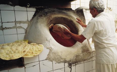 A baker makes kaboos (Arabic style bread) in a clay oven