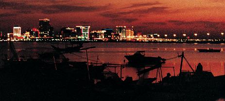The Manama skyline, with fishing dhows silhouetted in the foreground