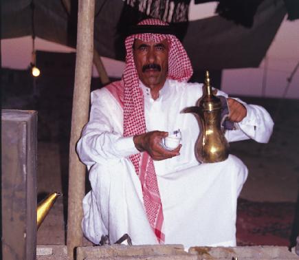 A Saudi man pours a cup of Arabic coffee for Ali